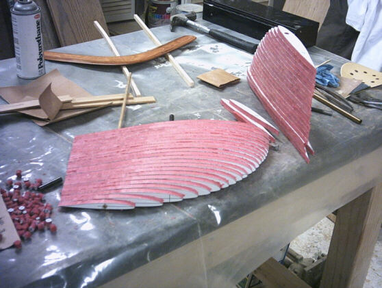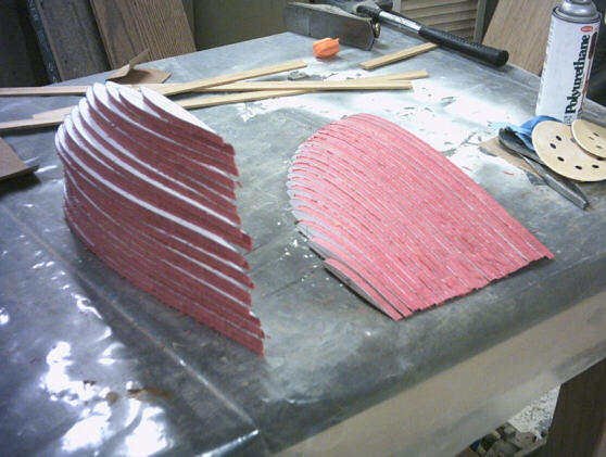Here I'v got both tips stacked, and one has its 1/4" aft stacking axis installed as well. The next step is to glue all the ribs together and clamp them with theaded rods installed in the stacking holes. When I glue them, I'll probably re-order the ribs so that the sides with the template paper glued to them face inboard, and not outboard as shown.