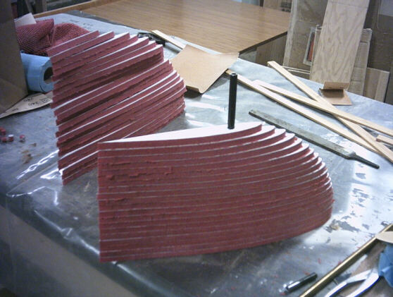 Last week I also started working on what I call the "default wingtips." These are the basic wingtips that get molded onto the ends of the wings. My original intent was to have the tips CNC milled according to a very nice 3D model that Brad Hill did for me. However, it turned out that the CNC milling was more expensive than I originally anticipated. So I decided to go with a simpler tip design that I could easily implement using the "rib stack" technique that we also used for the stabilizer tips and the wing/fuselage fillet. So far I've got all 23 rib pairs bandsawn and sanded to profile, and also bored for the threaded-rod stacking axes.