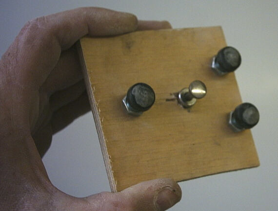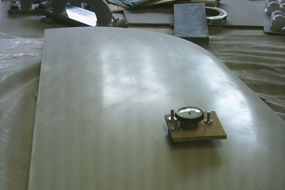 The wave guage on the measurement surface. The dial indicator is just friction-fitted into a reamed hole in the plywood.