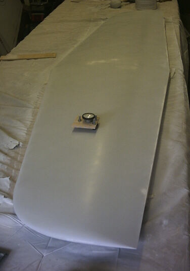 By the end of my Sunday afternoon session, I had sanded about all of the plug as I thought needed it, and now it is ready for a coat or two of the Poly-Lux gloss white.
