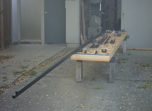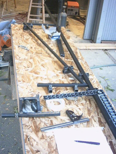 And here's the jig loaded for a half truss. After welding all this stuff togeher I'll rotate the part 180 degrees, plop it back into the jig, and then weld together the other twelve feet. Actually, I'll only weld together another eight feet; to keep these parts car-top transportable I'll leave them at the 20-foot length of the available steel tubes until I get them up to the shop. At that time I'll use the jig to splice on the extra four feet required to frame the last truss bay.