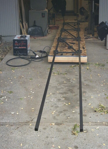 And here's the first twelve feet of truss. After this photo I did the rotation and welded together two more bays, but when I was finished it was too dark to get a good photo of the assembly. And after that I went inside...