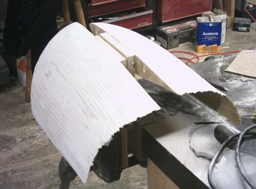 ...So I went inside to work on the winglet transitions. These next two photos show how I've slathered the two transitions with Bondo to fill in the trenches.