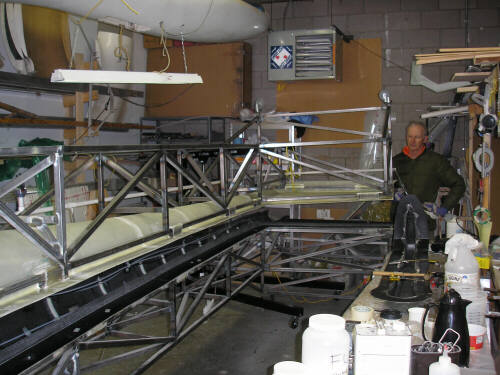 After this mold shell cures, our next step is to assemble the steel support truss and bond it onto the grotty side of the mold bed. After that, we separate the mold bed from the flanging patterns (but not the wing plug), roll it over, wax up the flange surfaces, and lay up the mold for the top surface. After that, the top side truss goes together and on, and then we can crack it open and retrieve the wing plug. And then we do it all over again for the left wing!