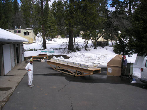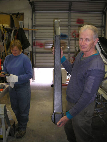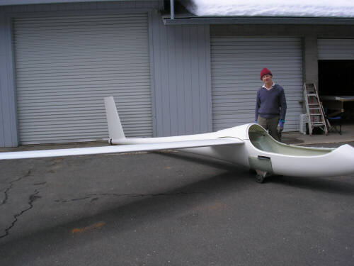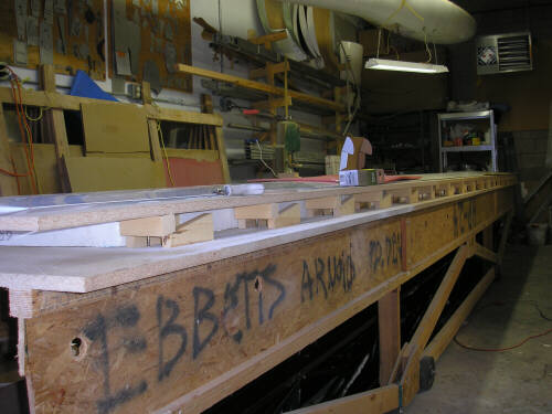 Here's another round of photos from ADF IV. We joined the carbon-intensive shells of Brad Hill's lightweight HP-24, and then rearranged all the big stuff in my two shop bays so we could concentrate on the wing molds. With the platform table in the main shop, we arranged the right wing plug bottom-side-up on the table and built the patterns for the flanging features along the leading edge and trailing edge. Note the system of wedges that I developed in order to be able to adjust the flange to match the leading and trailing edge within about 0.020" (.5mm) or so. This is one of the things that I was anxious to do as right as I could. On top of the wedges is a foundation strip of 3/4" fiberboard, and on top of that is a strip of 3/16" masonite to form the flange surface. Not shown are the patterns for the squeeze-out trenches along the leading and trailing edges (half-round molding from the hardware store) and ten indexing hemispheres. Most of that stuff is tacked together with hot melt glue; on Saturday and Sunday we had two glue guns running full time.