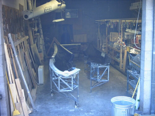 The rearranged (and still too messy) shop, with fuselage molds in place.