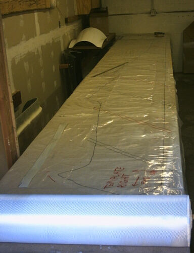 This is a ply of 7725 that Doug and I draped into one of the molds, taped in place, and then cut along the perimeter. Afterwards, we re-draped it onto the table and used it to make the first of several templates for the subsequent plies. The valuable (or at least expensive) lesson we learned doing this first ply is that masking tape will stick to 7725 like there is no tomorrow. We eventually gave up trying to remove the masking tape tags, and I will probably cut this ply up for patches and local reinforcements. I might try some acetone to loosen the tape, but I haven't decided for certain yet. Also noteworthy is that I've re-draped the fabric so that it is straight along the keel. I believe the fiber misalignment inherent in that doing it that way won't substantially affect the strength or stiffness, and I'm pretty sure that it will make it much easier to cut and arrange the plies.