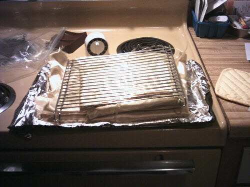 The evening before the big layup, we were all sitting around watching MythBusters on DVD, and the oven timer rang to tell us that the Kevlar was done. We baked it to get all the moisture out, and then bagged it to keep it from absorbing any more.