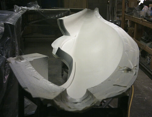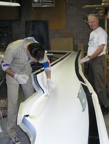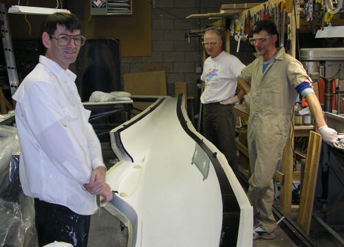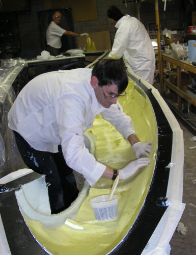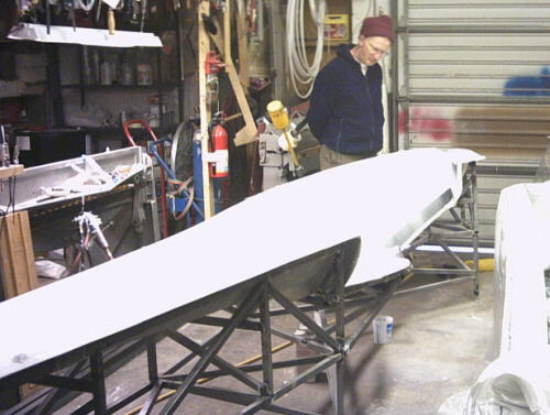 On the afternoon of 27 December, Brad Hill, Doug Gray, and I waxed the right-side fuselage mold and then sprayed it with gelcoat. The next day, we reconvened at the shop and set about the final preparations for laying up the right fuselage half. And at 13:10 we mixed the first batch of resin and got started.