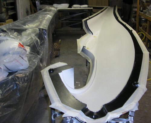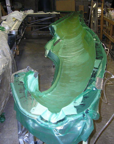 Also, we never did get around to starting on the left-side fuselage half. By the time we finished the right half, we had used up all of the vacuum bag material that I'd bought, we were too beat to wax and gelcoat the left-side mold, and we knew that we'd need to re-cut the right-side veil cloth to make it drape better. But, hey; half is definitely better than none.