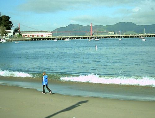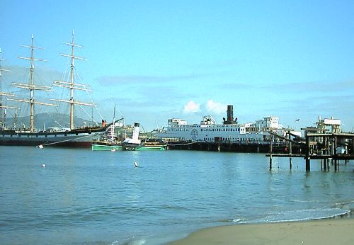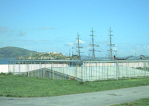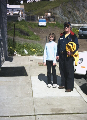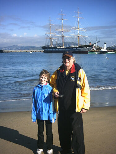 After the obligatory round of introductions, we arrange for Alia's luggage to ride the school bus, and then hang around the nearby waterfront for a quarter hour or so. Alia tells of her night and day as galley crew on the Balclutha. The ship's officers had of course shouted orders and encouragement, not all of it polite. But she is well-centered and the experience had been interesting and rewarding. Later, Alia picks among the boulders on the breakwater, mildly tormenting the many crabs, mussels, and barnacles there. Roger and I sit and rest on the cobbles at the edge and look out over the bay and Alcatraz and the Golden Gate and its big reddish bridge. Roger tells something of the history of the thick-skinned Balclutha.