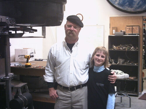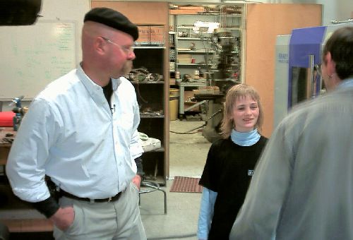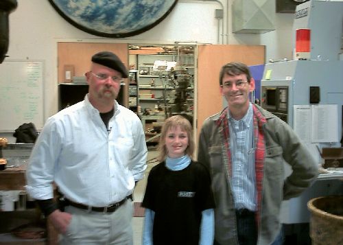 The shop tour lasted for about half an hour, which is about as much time as I'd want to steal from people who are generous and gracious, but obviously have a lot of stuff to get done in a day. Jamie met us at the door, showed us the jetpack machine he's building from plans, and showed us the machine shop and main shop floor. He gave us a quick tour of the upstairs MythBusters headquarters, complete with a quick hello from executive producer Peter Rees. Jamie even gave Alia a MythBusters T-shirt that says "Human Guinea Pig" on the back.