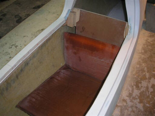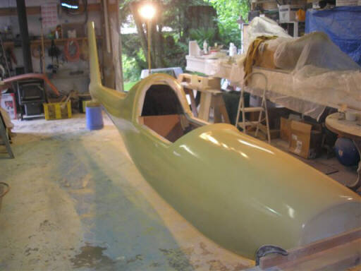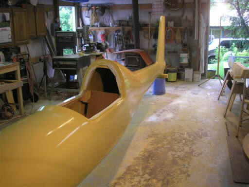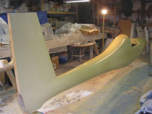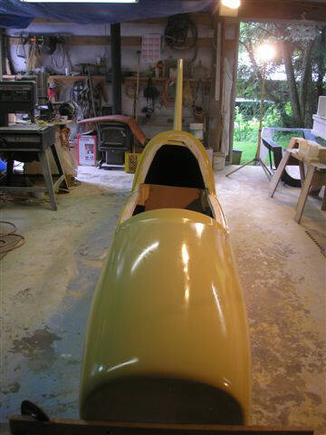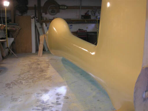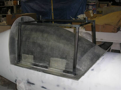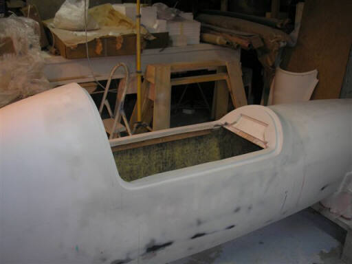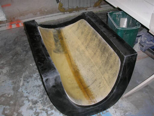 The canopy mold, containing the cut away portion of the fuselage plug. The cut away portion will be discarded, and Brad will make a new male canopy plug from the mold.