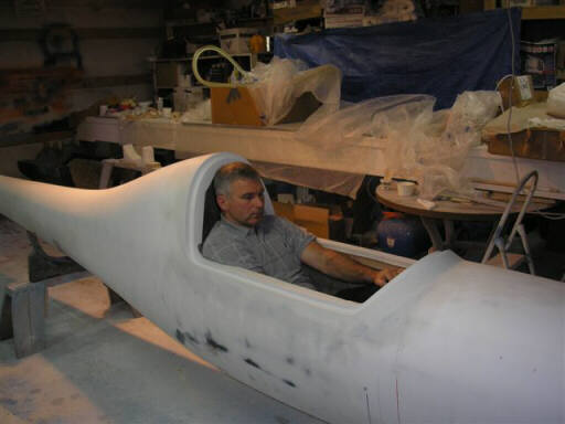 Brad's friend conducts a sit-in test. The shoulders look tighter than they'll be in the actual fuselage because of the extra width of the molding rails.