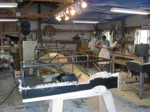 By Tuesday morning we'd completely finished off the right-side truss and parts of the left, and had one day left in the Akaflieg. We put our heads together and decided that instead of laying up the left mold shell we'd finish welding the left side truss, and that later Brad would convene another Akaflieg to lay up the left mold shell. Here Doug clamps the "crooked ladder" for the left side keel on top of the right side truss. Using the right truss as a foundation for the left let us have a fair amount of confidence that the truss would fit onto the as yet unmade left side mold shell.