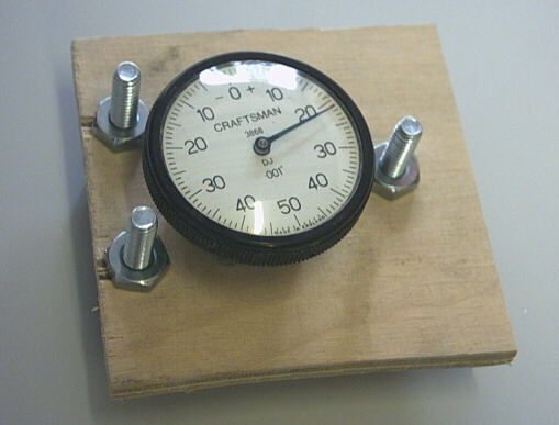 A closeup of my improvised wave guage. The dial is from a general-purpose indicating kit, and the chassis is a chunk of 1/4" plywood.