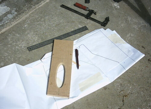 This shot is from a couple of weeks ago. It shows the piece I made to add the detail features for the elliptical opening in the top of the fin spar. Rather than trying to cut and rout these features into the top of the fiberglass and bondo squish plug, I just cut and routed them into a chunk of 1/2" MDF, and then glued that to the top of the squish.