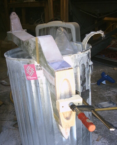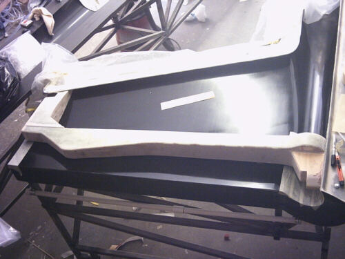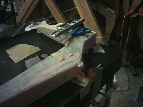 This view of the fin spar plug resting on the fuselage mold shows how the fin spar will fit into the vertical stabilizer.