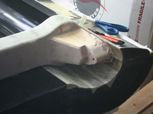At the bottom of the fin spar plug, here I'm casting the fuselage boom radius onto the bottom of the plug where it extend aft to form the bottom rudder hinge and rudder stop platforms. The yellow stuff on the fuselage mold is tooling wax of the expected fuselage skin thickness. The masking tape helps protect the mold surface from the bondo.