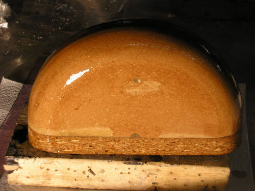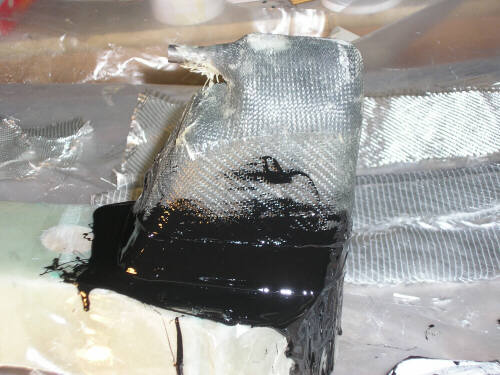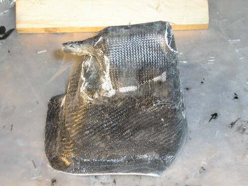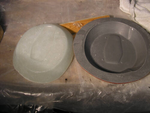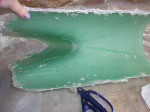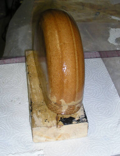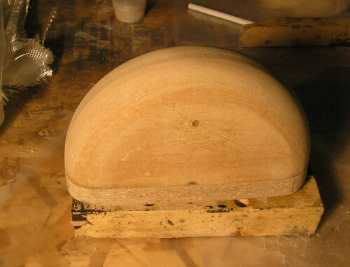 Anyhow, here's sme photos of the latest stuff at the shop. The thing that looks like half a cheese is the male mold for the pneumatic tailwheel fender. It's made of layers of particle board bandsawn to rough shape and then turned to profile on the lathe. In the photos Brigitta is varnishing it. We're making the exterior tailwheelfairing as a separate part, you'll see more photos of our new attempt on that soon enough. Theres also a couple photos of a new mold for the bottom part of the vertical fin spar; I'm now resigned to making that a separate part.