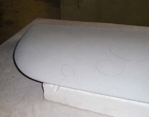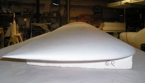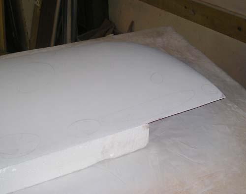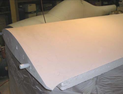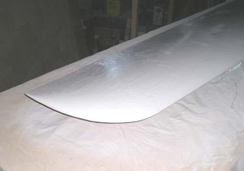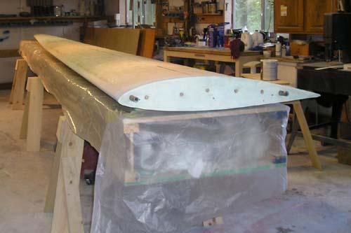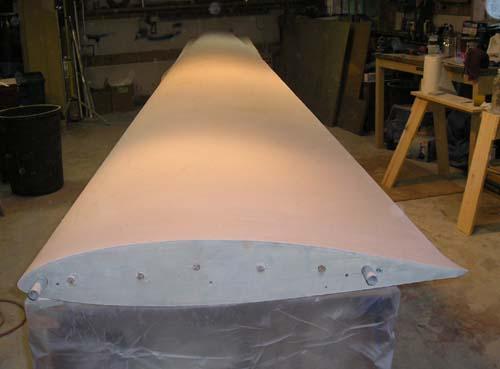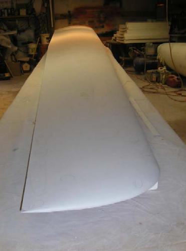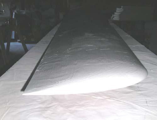 The raw fiberglass surface of the right wing plug, looking outboard over the trailing edge. Note the shiny band at about 75% chord. That's where there's a joint between sections of the styrofoam cores. I knew it would cause a tiny whoopsie in the surface, and here it is - but not anything a little sanding and fill won't put right. At the time, the flyingfoam.com hotwire machine had a maximum chord envelope of 30", so my 35" root chord wouldn't go through in one piece. I think that Bob at Flying Foam has since extended his machine to handle greater chords.