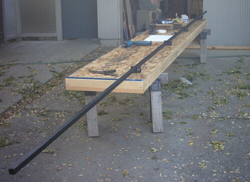 And here's the jig loaded for a half truss. After welding all this stuff togeher I'll rotate the part 180 degrees, plop it back into the jig, and then weld together the other twelve feet. Actually, I'll only weld together another eight feet; to keep these parts car-top transportable I'll leave them at the 20-foot length of the available steel tubes until I get them up to the shop. At that time I'll use the jig to splice on the extra four feet required to frame the last truss bay.