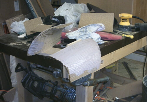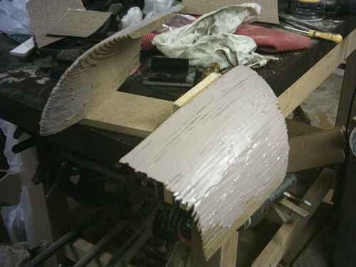...So I went inside to work on the winglet transitions. These next two photos show how I've slathered the two transitions with Bondo to fill in the trenches.
