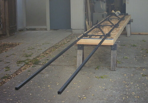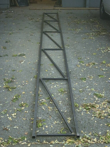And a few days later here I am back in the driveway loading the finished truss jig for the first welding session. I have two longerons, three diagonals, and four stanchions, which is what it takes to make twelve feet of truss.