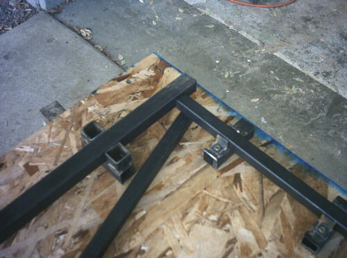 Here I'm starting to assemble the parts of the wing mold truss jig. The long 1" square steel tube is my straghtness reference; I put it in the cleats and then moved the cleats around until they were at the right longitudinal stations and I could sight down the tube and have it not deviate more than about 1/8" from straight. In truth, the methods that I'll use to attach the trusses to the mold shells with big globs of schmoo are really forgiving, so anything within about 1/2" of straight is fine.