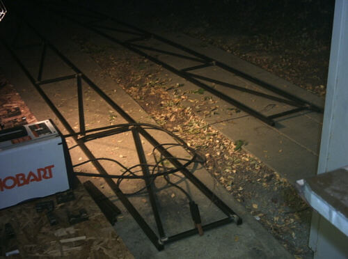 And here's the first twelve feet of truss. After this photo I did the rotation and welded together two more bays, but when I was finished it was too dark to get a good photo of the assembly. And after that I went inside...
