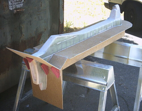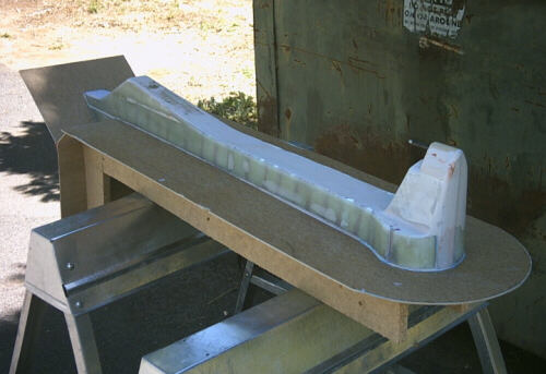 These two photos of the fin spar plug show how I've added the 1/8" masonite flange platform. Note also that I've added a temporary platoform at the upper aft corner, where the fin spar becomes the fin tip rib. It's just held on with PVC foam chocks and hot-melt glue. After I've done the first mold portion, I'll break away that temporary platform and them wax and mold the tip rib area. That yields a 2-piece mold that will allow the release of this complicated part. Also note that I've inserted a pin and bushing into the lower rudder hinge support. The pin will be removed later; the bushing will become part of the mold. In production, I'll drill through that bushing to get a perfectly-aligned lower rudder hinge axis.