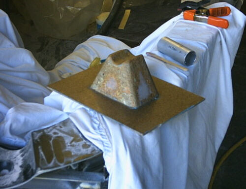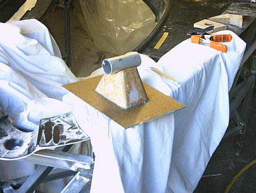 The guide support is a generic little pyramid that will support the guide for the control push-pull tubes. The support has a saddle in the top for the 1.25" OD aluminum tubing of the guide, and will have its base cut off at various heights for the different locations. We'll just glass these things to the inner surfaces of the wings and fuselage wherever we need them using fiberglass tapes. I made the plug for the support out of fiberboard using a 1.25" spade drill and a bandsaw over the last few Wednesdays, and now have them shaped, sanded, varnished, platformed, and waxed for molding.