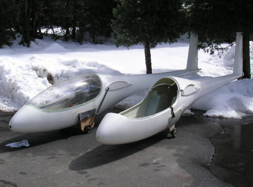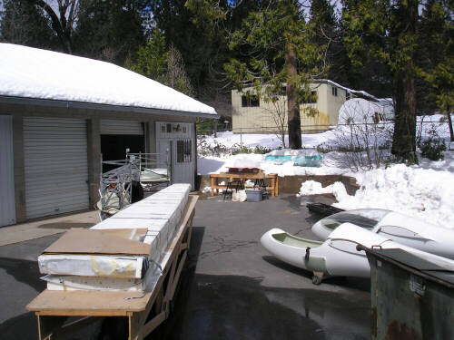 Here's another round of photos from ADF IV. We joined the carbon-intensive shells of Brad Hill's lightweight HP-24, and then rearranged all the big stuff in my two shop bays so we could concentrate on the wing molds. With the platform table in the main shop, we arranged the right wing plug bottom-side-up on the table and built the patterns for the flanging features along the leading edge and trailing edge. Note the system of wedges that I developed in order to be able to adjust the flange to match the leading and trailing edge within about 0.020" (.5mm) or so. This is one of the things that I was anxious to do as right as I could. On top of the wedges is a foundation strip of 3/4" fiberboard, and on top of that is a strip of 3/16" masonite to form the flange surface. Not shown are the patterns for the squeeze-out trenches along the leading and trailing edges (half-round molding from the hardware store) and ten indexing hemispheres. Most of that stuff is tacked together with hot melt glue; on Saturday and Sunday we had two glue guns running full time.