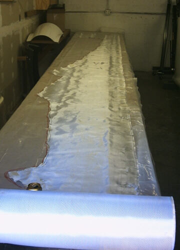 This is a ply of 7725 that Doug and I draped into one of the molds, taped in place, and then cut along the perimeter. Afterwards, we re-draped it onto the table and used it to make the first of several templates for the subsequent plies. The valuable (or at least expensive) lesson we learned doing this first ply is that masking tape will stick to 7725 like there is no tomorrow. We eventually gave up trying to remove the masking tape tags, and I will probably cut this ply up for patches and local reinforcements. I might try some acetone to loosen the tape, but I haven't decided for certain yet. Also noteworthy is that I've re-draped the fabric so that it is straight along the keel. I believe the fiber misalignment inherent in that doing it that way won't substantially affect the strength or stiffness, and I'm pretty sure that it will make it much easier to cut and arrange the plies.