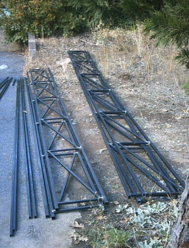 And here's how we finished on Sunday afternoon. You can see that we've got eight full-length trusses, and a bunch of leftover material that I'll use to join the pairs of trusses into space frames.