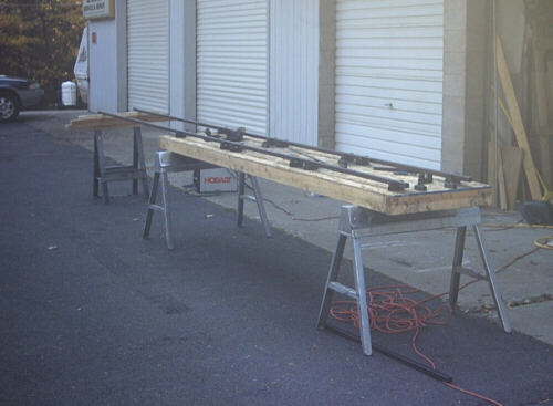 This is what we'd finished when we knocked off on Saturday afternoon. As you can see, we've finished three full-length trusses in addition to the two shorties that I made at Steve's to figure out that MIG welding stuff.