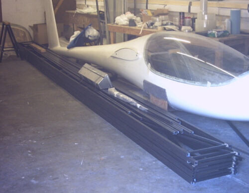 On Saturday morning, Doug and I hooked up my extra glider trailer (the one I'd bought to cart the wing plugs all over the countryside) with about 500 lbs of 1" and 3/4" square steel tubing and headed up to the shop.