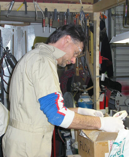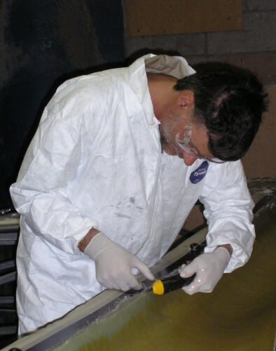 Brad mixes a batch of flox to goo in around the lift carrythrough tube sockets.