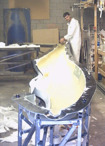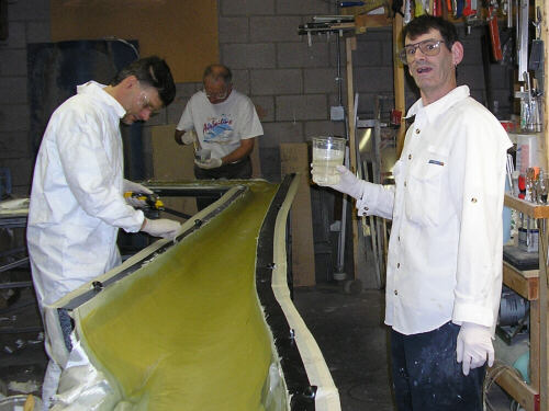 On the afternoon of 27 December, Brad Hill, Doug Gray, and I waxed the right-side fuselage mold and then sprayed it with gelcoat. The next day, we reconvened at the shop and set about the final preparations for laying up the right fuselage half. And at 13:10 we mixed the first batch of resin and got started.