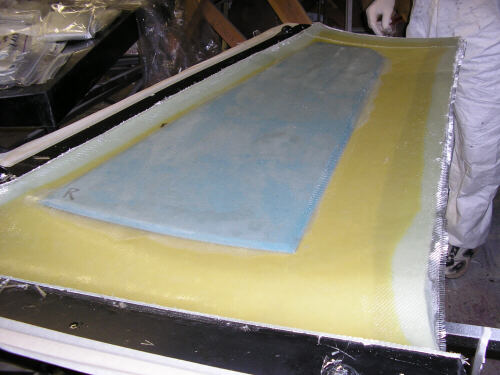 About an hour and a half in, starting the third layer. This is 5 ounce Kevlar at +/-90, ending 2" from every perimeter and overlapped with 4" perimeter tapes.