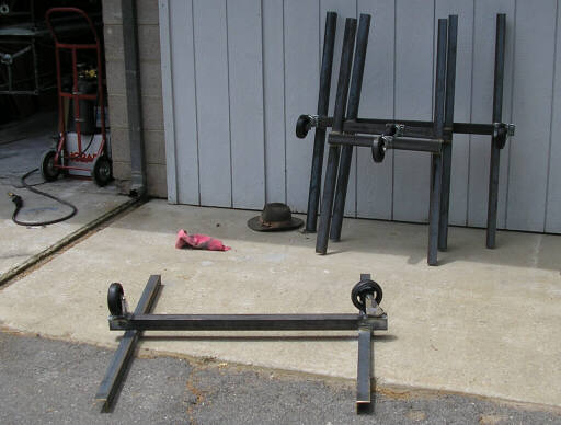 Since the last Update, we've finished the basic work on all four wing molds; the most recent big thing was last Thursday when we bonded the steel support truss onto the last mold shell, the upper left. On Friday we cracked open the left wing molds and got the plug out. Also, I welded up two sets of wheeled carriages that we will use to roll the wing molds around between the shop bays.