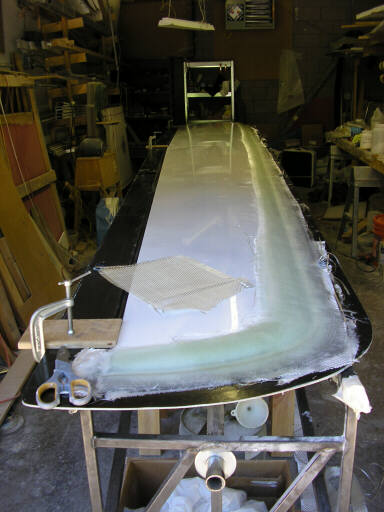More recently, on Saturday 3 June Brigitta and I put the plug back in the mold and laid up the molding feature that forms the joggle that joins the left wing skins along the leading edge. These removable pieces attach to the upper wing skin molds. After this part cures, we will remove it from the mold and then lay up fiberglass on its molding surface equal to the expected thickness of the lower wing skin.
