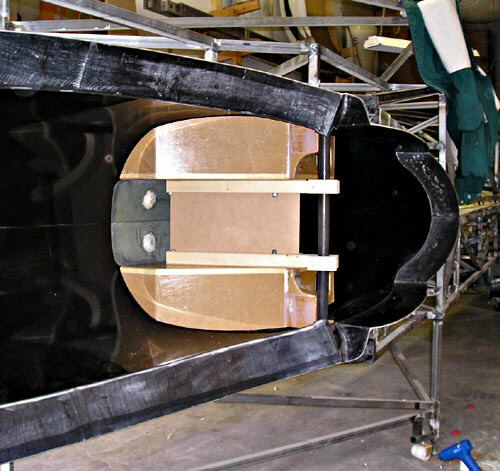 This one shows the mated fuselage molds with the two gear well box plugs held in place by the alignment fixture. The fixture is clamped to a steel tube suspended between the alignment holes for the forward lift carrythough tube.