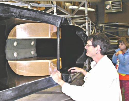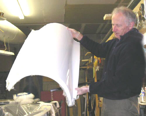 Doug holds up the as-removed gear well plug and mold. You can see the PVC foam chocks I used to glue the plug to the mold surface, and other interior features of the plug. Note the T-nuts inserted into the interior stiffeners; these were for the bolts that attached the plug to the alignment fixture.
