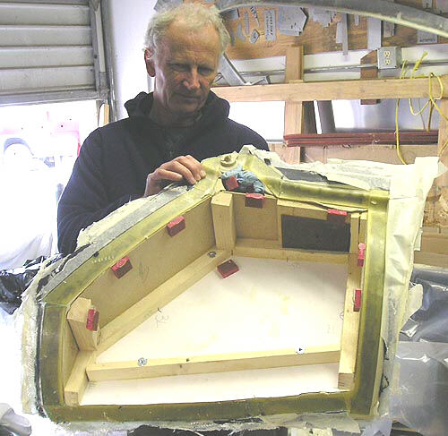 Here I've finished gluing the gear well box plugs to the mold surfaces usng PVC foam chocks and hot-melt glue. That's daughter Raen in the background.